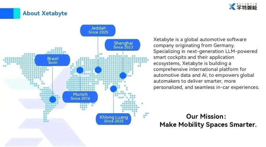 字特智能是一家起源于德国、总部位于中国的全球化汽车智能科技公司,致力于推动智能座舱、车载大模型平台及其生态的落地应用。公司拥有跨中德美多国背景的核心团队,具备国际化视野与深厚的产业经验。目前,字特智能已在欧盟、俄罗斯、泰国、沙特阿拉伯等多个地区开展业务布局,并通过技术服务、本地适配与品牌合作等方式支持车企实现智能化转型。